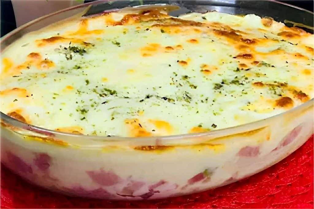 - Utilize: o presunto picado, as azeitonas e os ovos cozidos e cortados ao meio para rechear. Cubra com o molho branco, distribuindo bem.