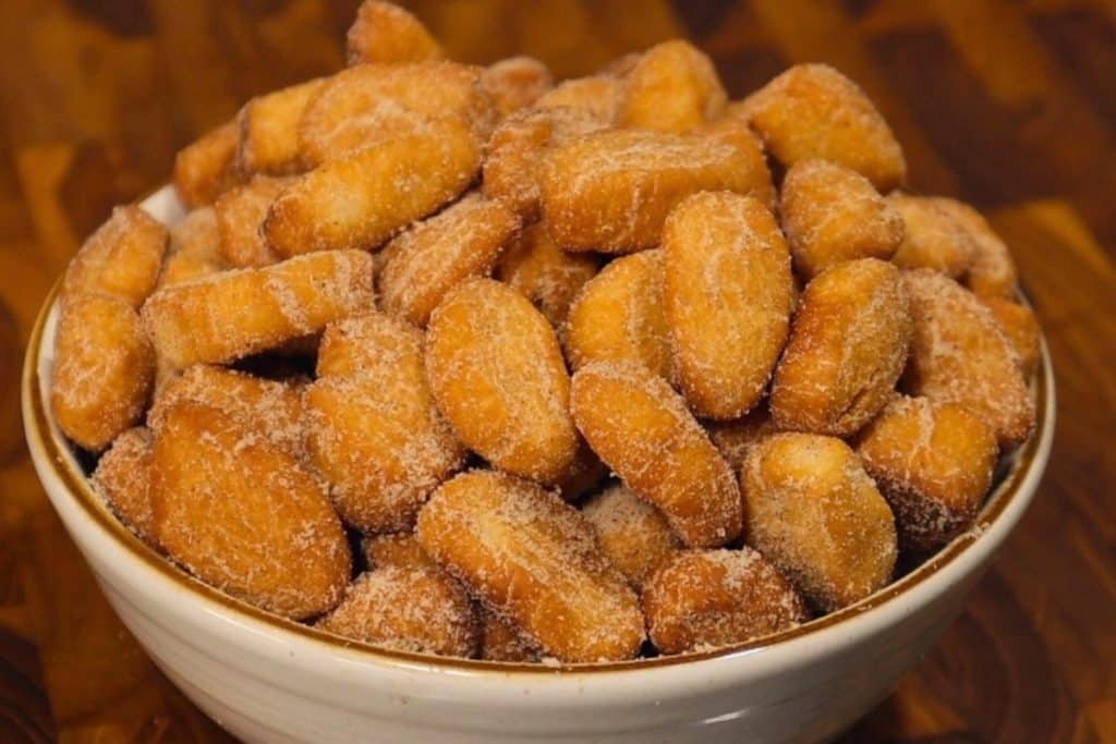 - Retire do fogo, remova o excesso de óleo em papel toalha e empane os biscoitinhos fritos em açúcar + canela em pó.