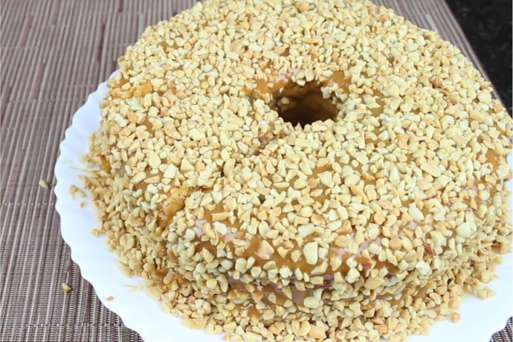 - Cubra toda a superfície do bolo com essa cobertura e polvilhe o amendoim moído por cima para finalizar.