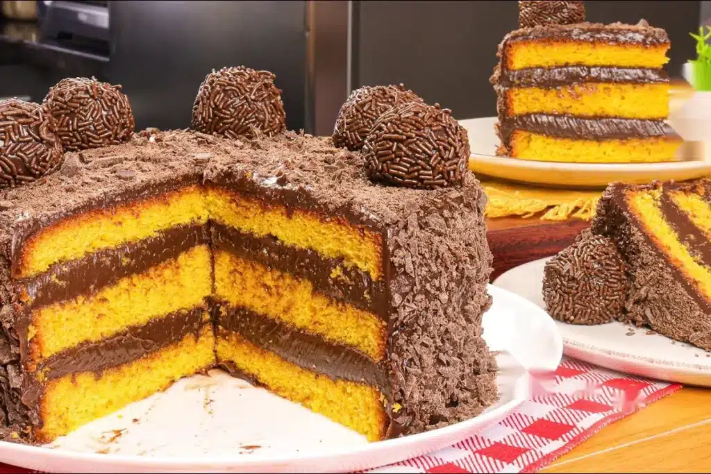 - Disponha os brigadeiros por cima do bolo para decorar, sirva e deguste seu encantador bolo de cenoura dos sonhos!