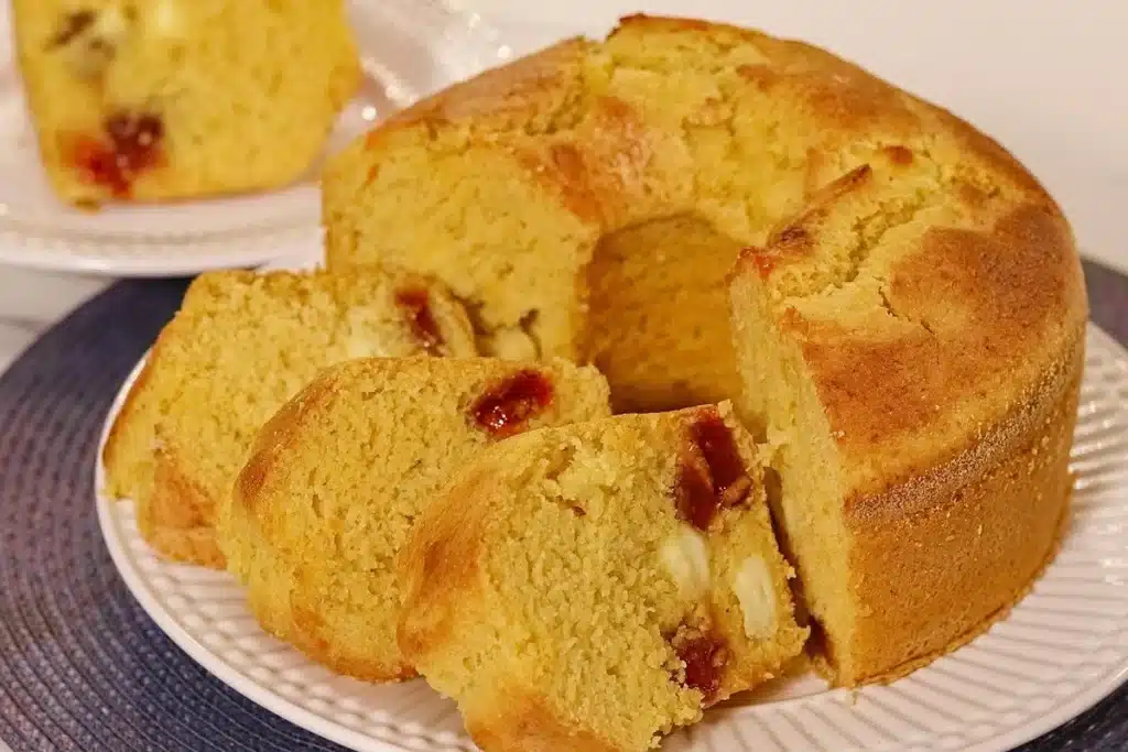 - Numa forma (20 cm de diâmetro) de furo central untada e polvilhada com fubá, despeje 1/3 da massa, e 1/3 dos cubinhos de queijo coalho e goiabada previamente empanados na farinha de trigo. Repita o processo até terminar os ingredientes.