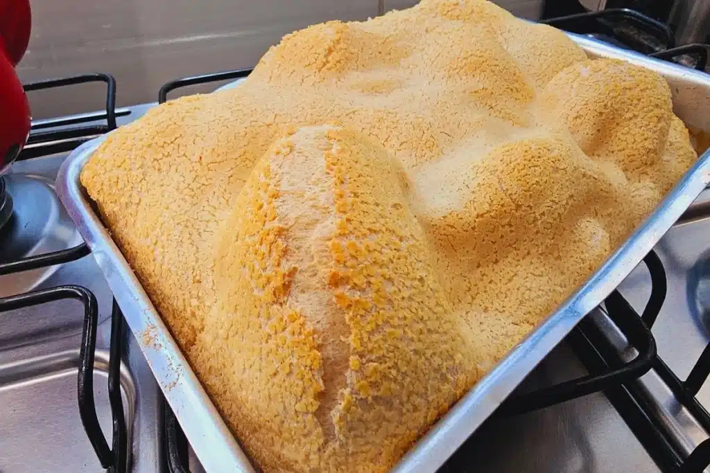 - Retire do forno, corte, sirva e desfrute do seu sensacional bolo de polvilho!
