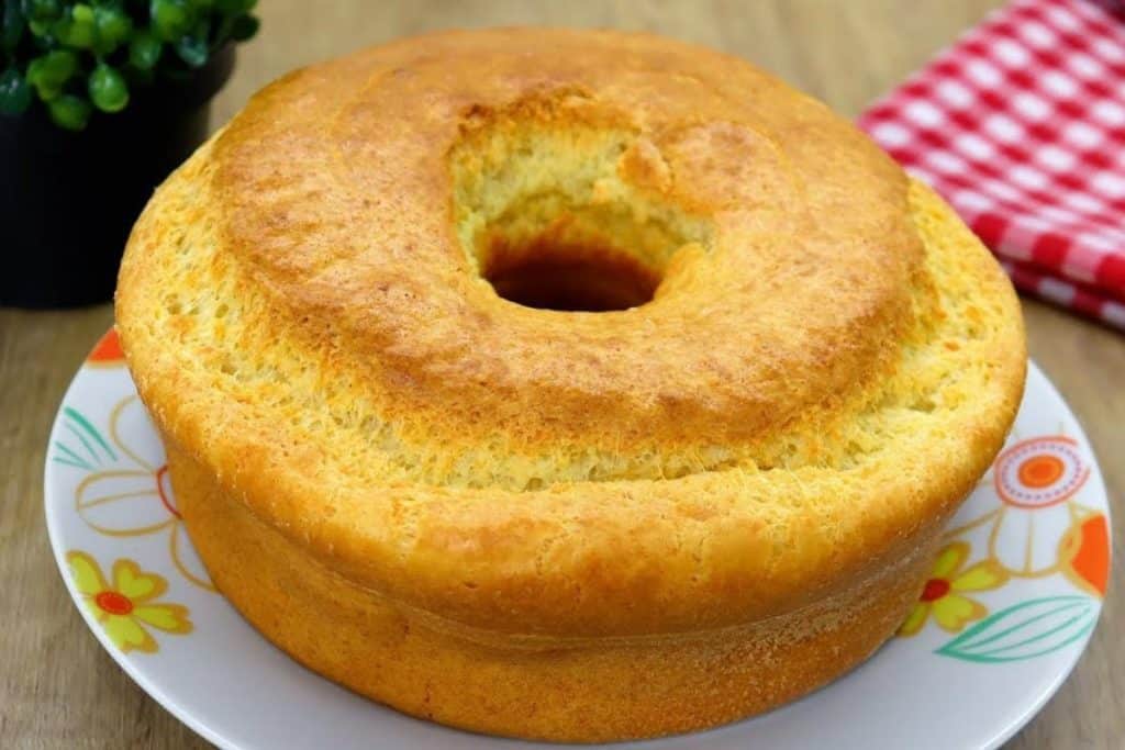 Para o bolo vamos usar polvilho azedo, óleo, leite, ovo, queijo parmesão, sal e fermento em pó. Bata no liquidificador os ovos, leite, óleo e o polvilho azedo. Junte o queijo parmesão e o fermento, batendo rapidamente para misturar. Despeje em uma forma untada e polvilhada com maisena, asse a 180° por 35 minutos. Retire do forno, deixe amornar, desenforme e aproveite seu bolo.