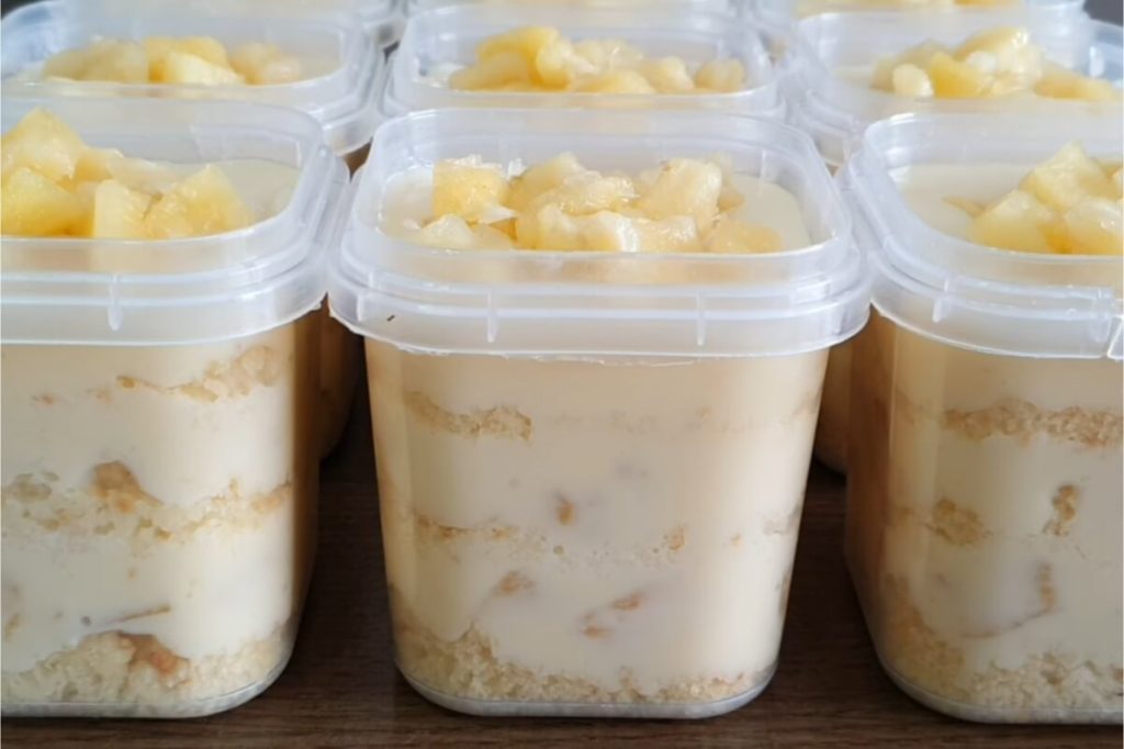 - Num pote descartável coloque uma camada de bolo esfarelado, molhe com a calda, e cubra com uma camada de creme de abacaxi.