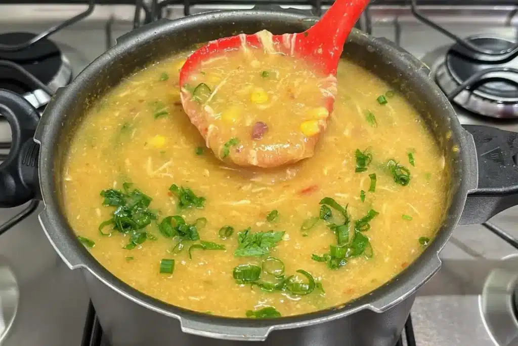 7. Volte o caldo na panela de pressão, adicione o frango desfiado, o bacon frito, o milho escorrido, o coentro picadinhos e misture tudo muito bem e deixe ferver por alguns minutos.