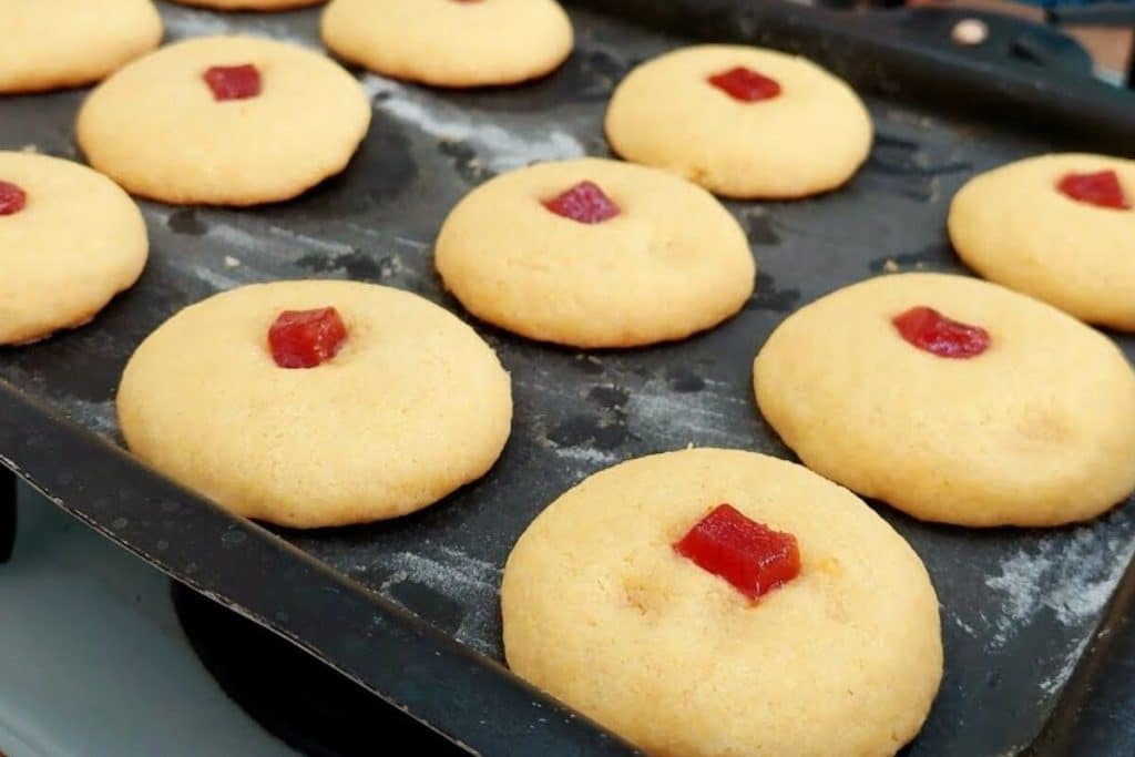 7. Finalize colocando um pedacinho de goiabada por cima de cada bolinha e leve ao forno pré-aquecido a 180ºC por aproximadamente 20 minutos.