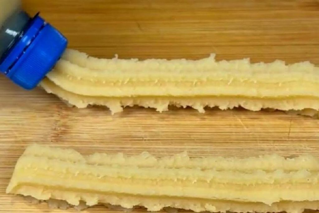 5. Transfira a massa para a garrafinha pet já preparada, então esprema e a massinha vai sair pela tampinha furada. Deixe os churros do tamanho que desejar e corte com a faca Faça isso sobre uma bancada limpa, modelando todos os churros até a massinha terminar.