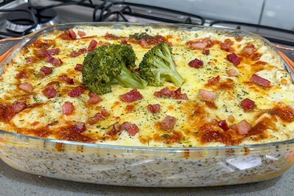 - Leve para gratinar em forno pré-aquecido a 180 graus por cerca de 20-25 minutos, retire do forno e finalize com bacon frito.