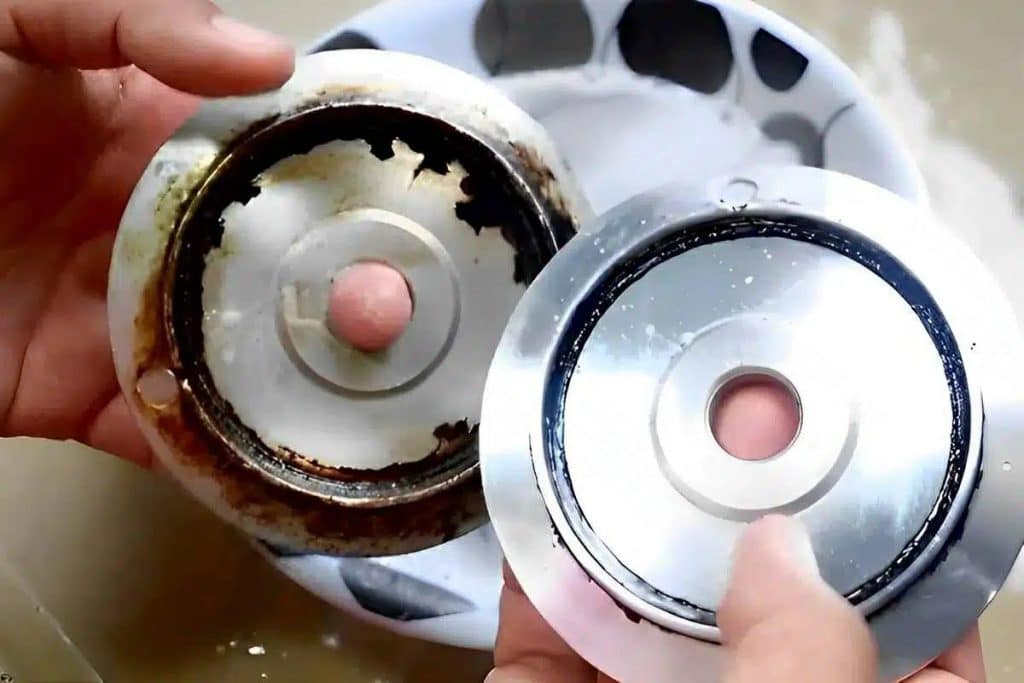 - Com a esponja de aço úmida, esfregue bem as bocas do fogão.
