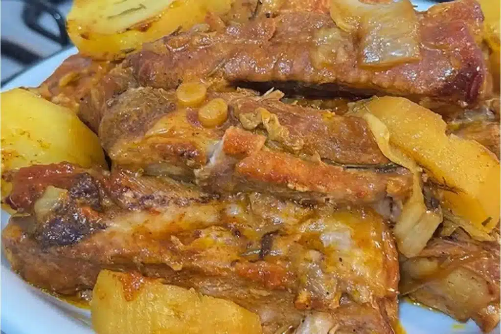 - Desligue o fogo, transfira a carne com o molho para uma travessa, junte as batatas, sirva e saboreie sua apetitosa costelinha de porco! Bom apetite!