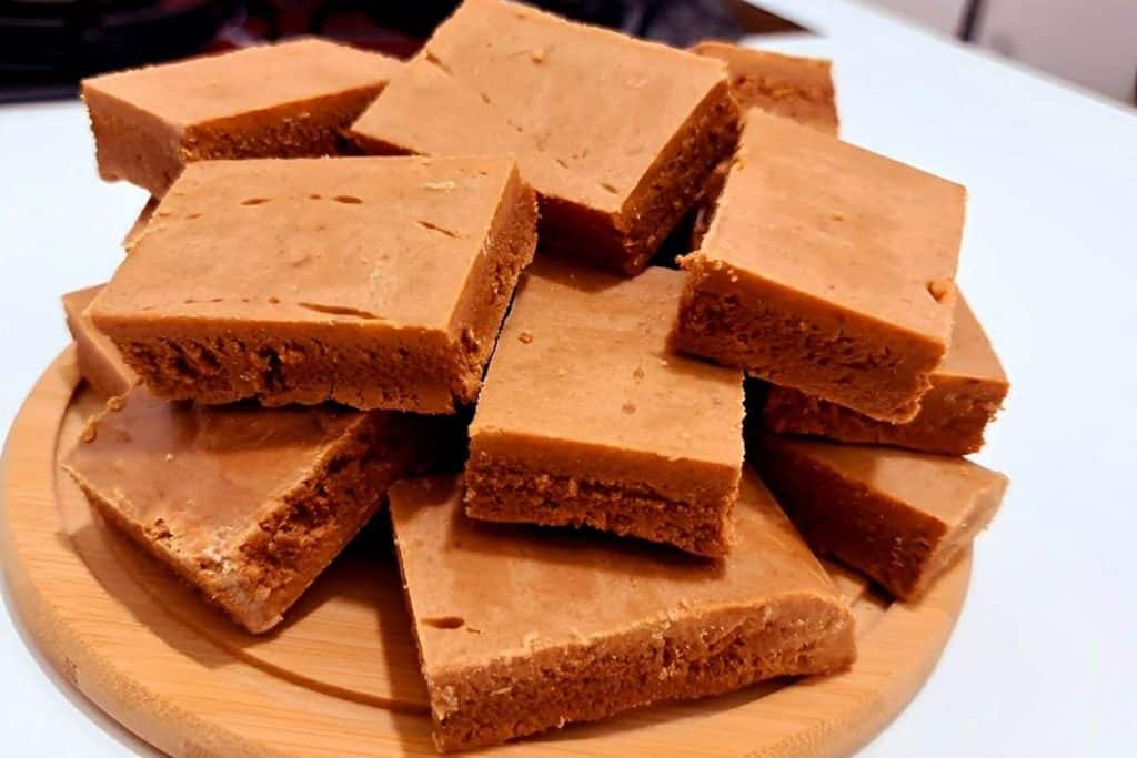 - Espere ficar um pouco firme, mas ainda morno, e corte em quadrados. Não deixe esfriar totalmente, pois irá endurecer e não dará mais para cortar.