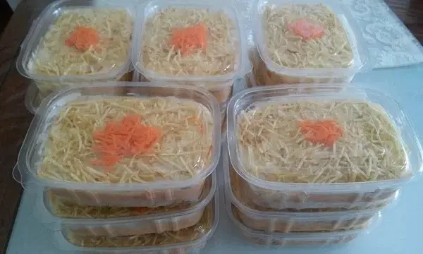 Para finalizar a torta de pão de forma, basta passar maionese sobre a torta e decorar com batata palha e cenoura ralada. Você ainda pode coloca-la em potes e vender por R$4,00 em média ou até mesmo fazer para o piquenique em família, para levar à praia ou para o lanche das crianças.