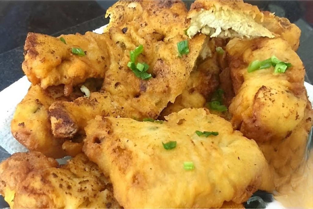 - Em outra tigela, coloque a farinha de trigo, a farinha de rosca, o sal, o gengibre, o cheiro-verde, os ovos batidos e misture bem.