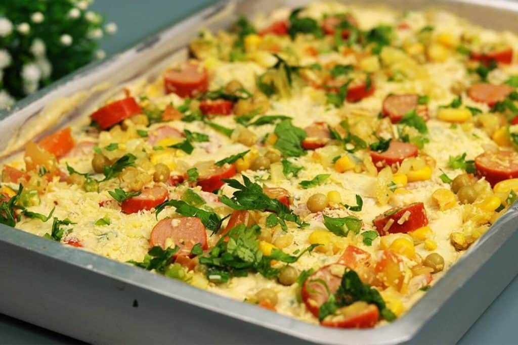 - Coloque numa vasilha a salsicha previamente aferventada por 2-3 minutos e cortada em rodelinhas, o tomate, o pimentão e a cebola picados, o milho verde e a ervilha.
