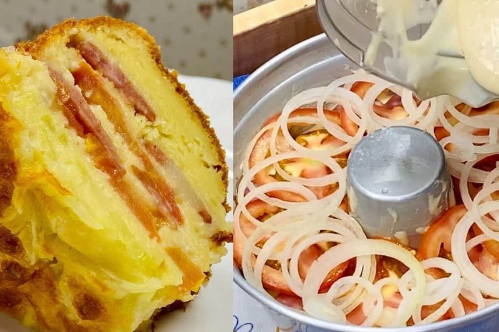 5. Repita as camadas de calabresa, depois coloque o tomate e a cebola e cubra com o restante da massa.