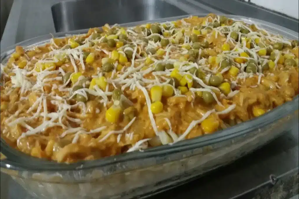 - Decore com o restante da lata de mix de ervilha e milho por cima e salpique queijo parmesão ralado.