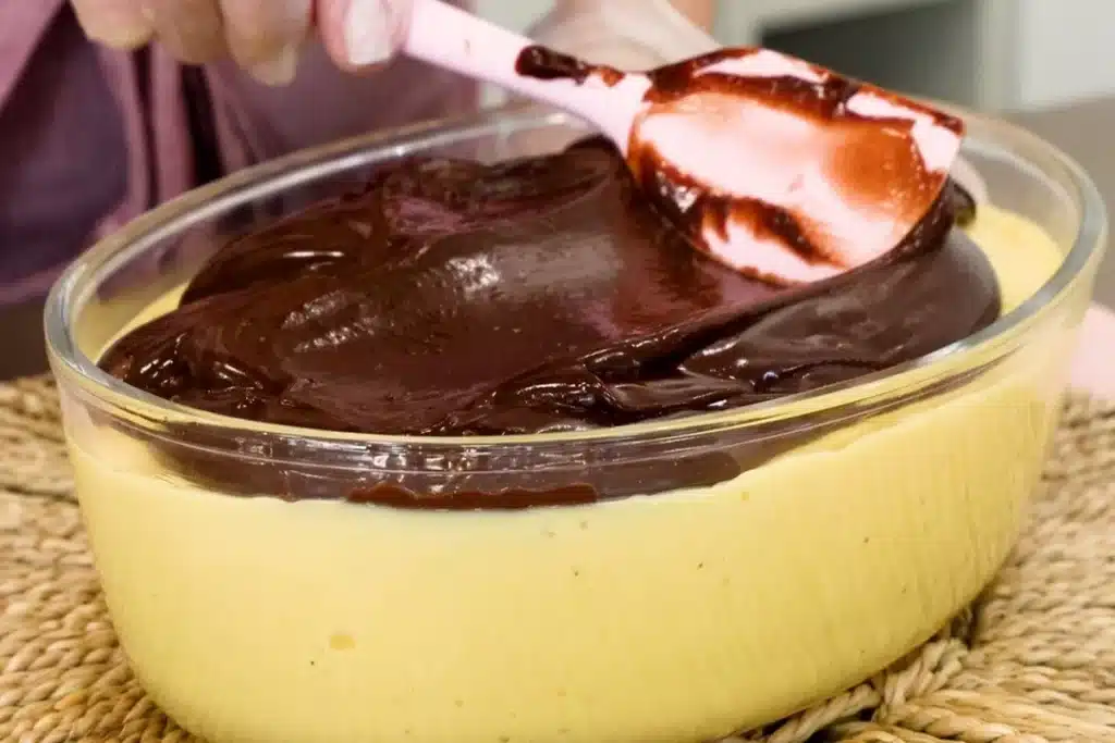 - Com a cobertura pronta, despeje e espalhe-a sobre a mousse.