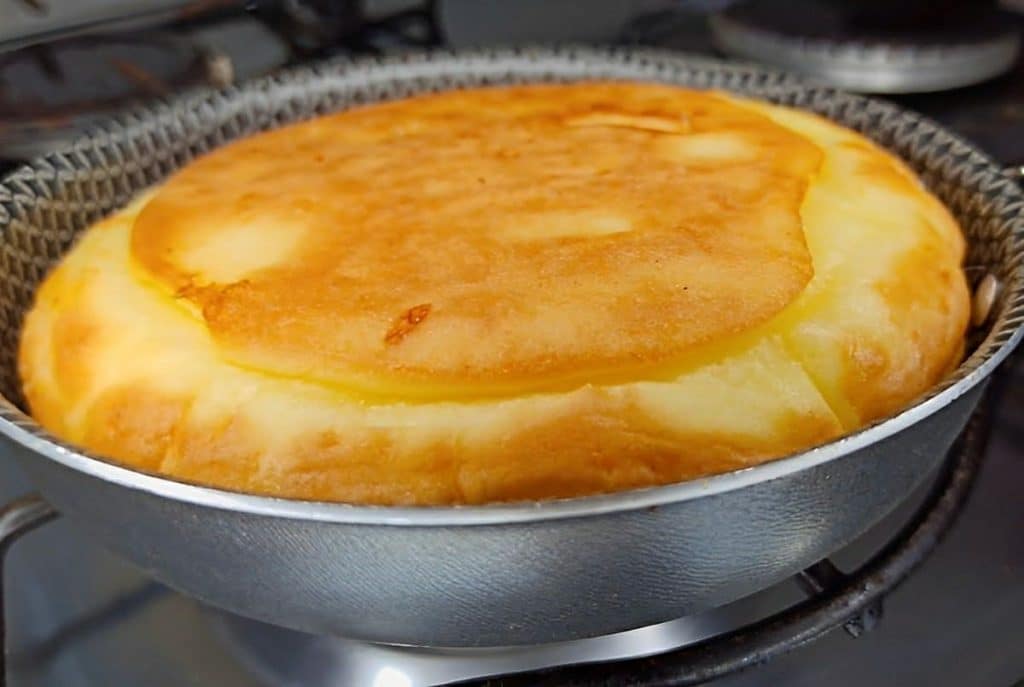 - Passe a massa para uma frigideira já untada, nivelando com cuidado. Utilize a tampa para cobrir e leve ao fogo baixo. Deixe dourar por cerca de 5 minutos de um dos lados e depois do outro.