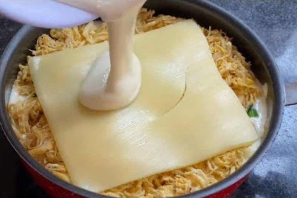 - Despeje metade dessa massa em uma panela untada com margarina, coloque 1 fatia de muçarela, faça uma camada de frango cozido, desfiado e temperado, mais 1 fatia de muçarela e cubra com o restante da massa.
