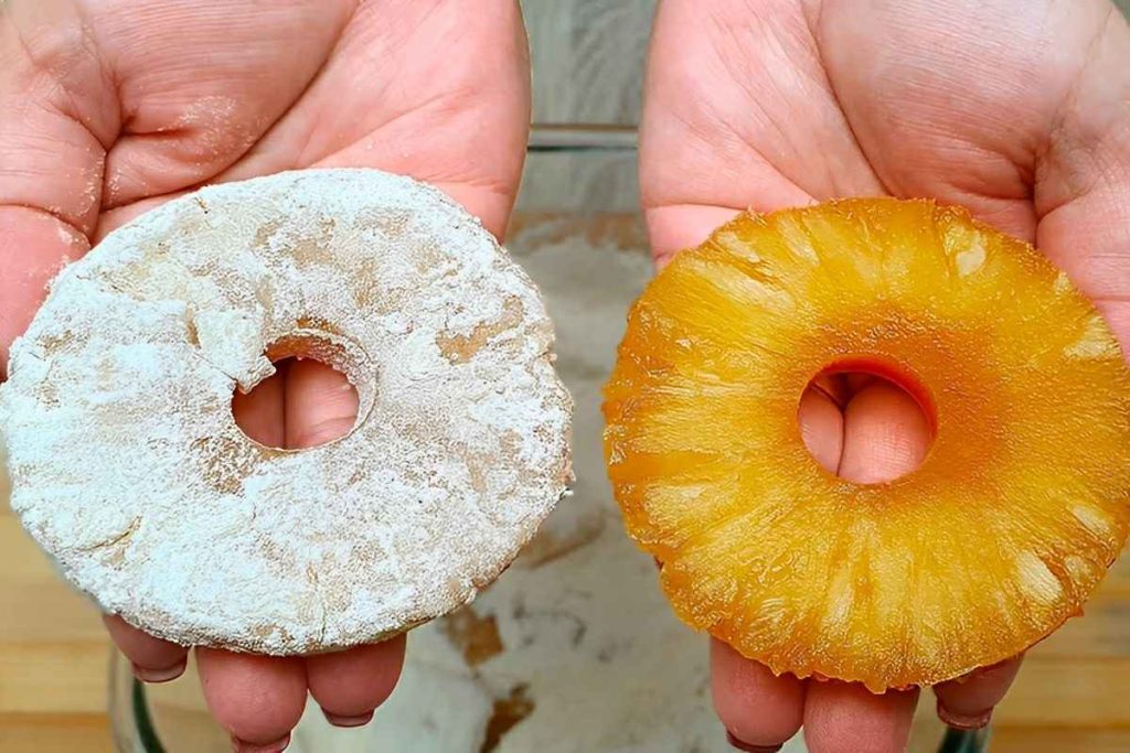 1. Coloque a farinha de trigo e o fermento numa vasilha e misture bem. Adicione o abacaxi picado e empane nessa mistura. Reserve.