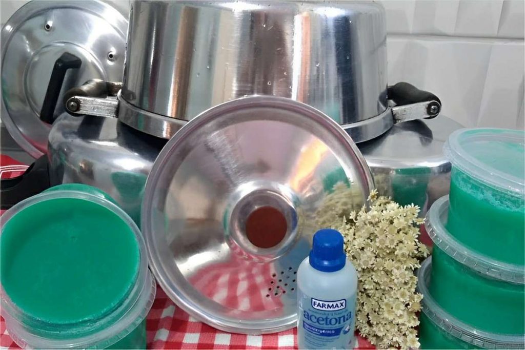 Para fazer essa pasta brilha alumínio, usaremos alguns produtos que são bem comuns em nossas casas e que talvez você tenha na sua. São eles sabão glicerinado de limão, açúcar, amido de milho, água, detergente de limão, e acetona. Nessa receita de pasta brilha alumínio, a consistência fica por conta do amido de milho e também do sabão glicerinado, que também concede poder de limpeza junto ao detergente. O açúcar deixa a mistura menos agressiva à pele, enquanto a acetona é a principal removedora de gorduras e sujeiras das panelas. Mas atenção, pois essa pasta pode tirar esmaltes e tintas de panelas que não são de alumínio puro!