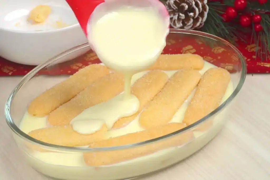 - Para a montagem, forre o fundo de um refratário com o creme, faça uma camada com os biscoitos champagne e cubra com creme. Repita esse processo até preencher o refratário, sendo a última camada de creme.