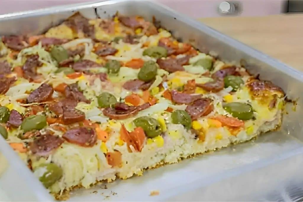 Pizza caseira feita com massa que não precisa sovar muito prática e deliciosa