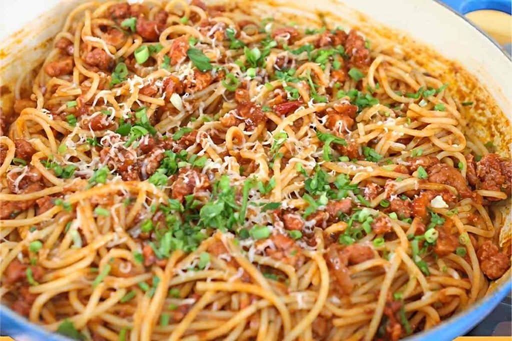 - Finalize com queijo parmesão ralado e cheiro-verde e saboreie essa delícia de ragu de linguiça com macarrão!