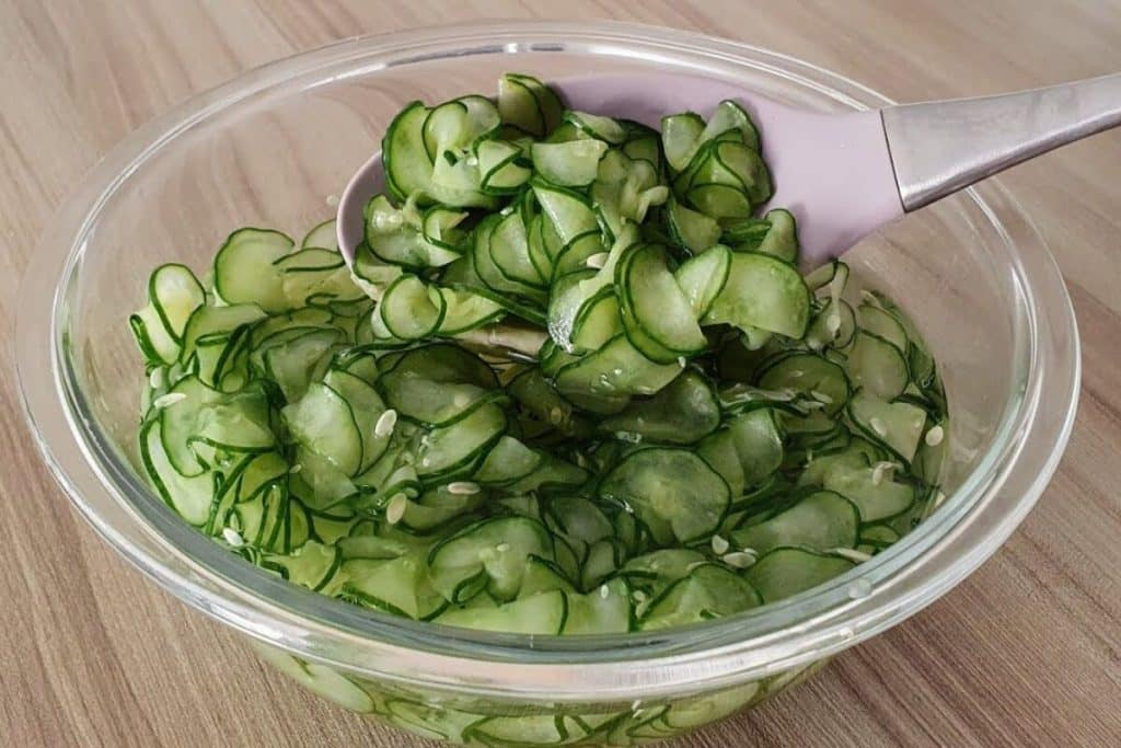 Preparar o pepino agridoce é fácil. O modo de preparo do pepino agridoce é simples, em um prato, você vai ralar os pepinos em rodelas bem fininhas. Em seguida, você irá transferir para uma peneira e acrescentar sal e misturar bem. Na sequência, você vai deixá-lo desidratar durante 15 minutos. E então, em uma panela, você irá colocar o açúcar, o vinagre de álcool e a água e levar ao fogo baixo e deixar ferver até ficar transparente. Em seguida, você vai desligar o fogo e reservar. Na sequência, você irá lavar o pepino embaixo da água corrente para retirar o sal, colocá-lo em uma tigela, adicionar a mistura que estava reservada, misturar bem e deixar esfriar por 4 horas. Por fim, você vai levar á geladeira dentro de um pote com tampa e consumir como e quando quiser. E então, você irá chamar a família toda para experimentar essa gostosura de pepino agridoce que é de comer rezando!