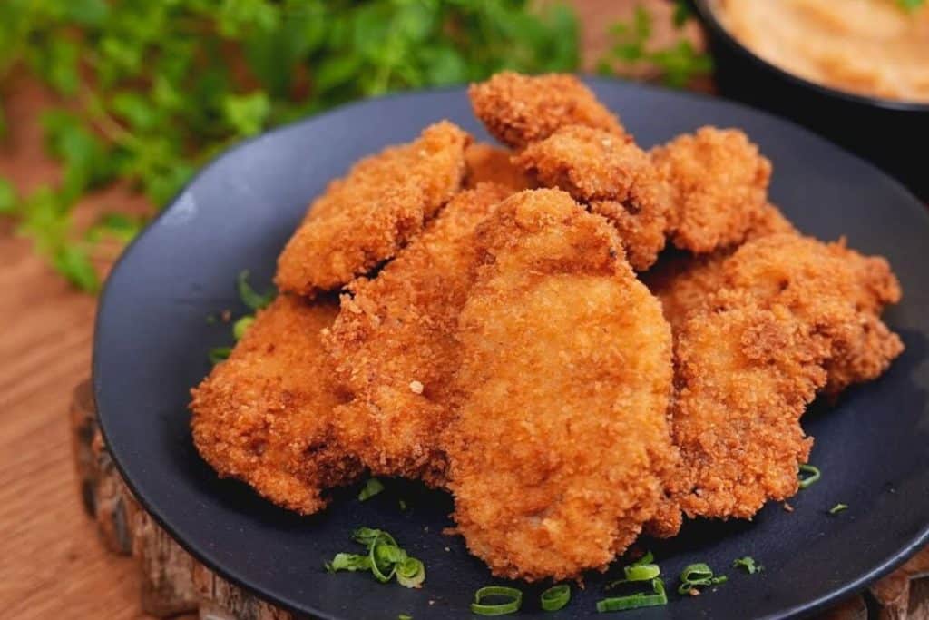 - Pegue um bife de file mignon suíno, passe no creme e empane na farinha panko.