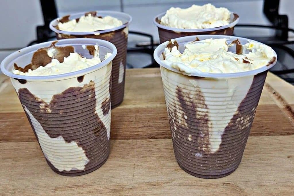 - Pincele o interior dos copos com essa mistura e leve para gelar por 5 minutos. Preencha com o creme, todos os copos e leve para gelar por 2 horas.