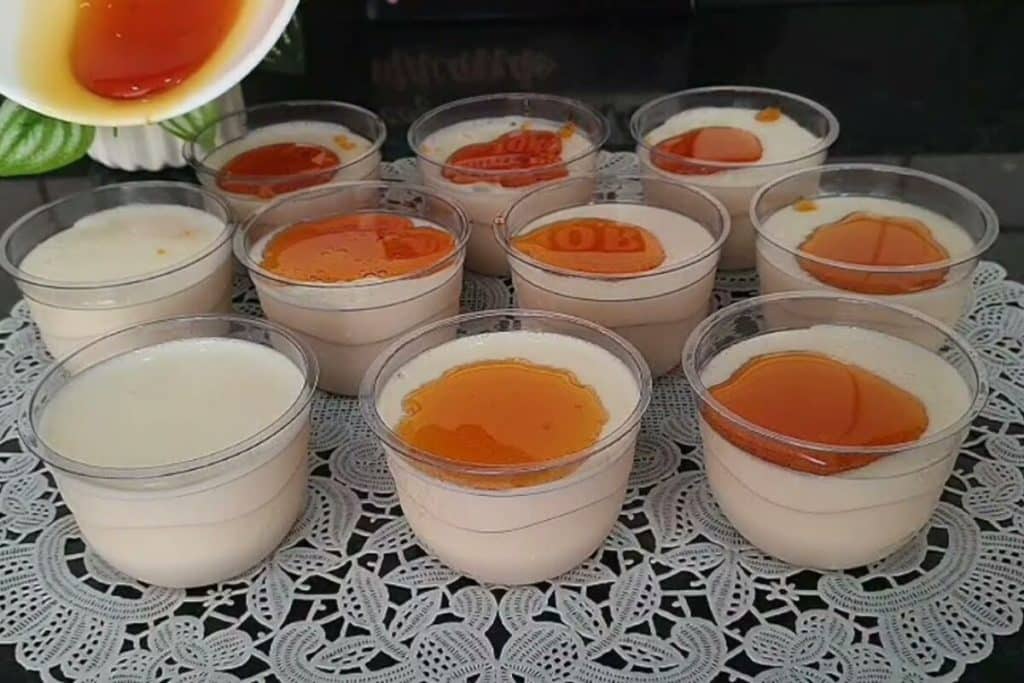 - Despeje essa mistura nos potes, tampe e leve para gelar por 2 horas. Retire da geladeira e coloque a calda sobre cada potinho.