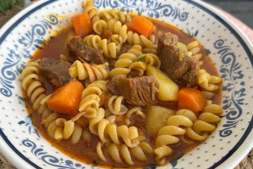 Para fazer sopa de macarrão vamos utilizar ponta de alcatra ou carne bovina de sua preferência, macarrão parafuso, bacon, molho de tomate, tomate, batata, cenoura, sal, pimenta caiena, páprica defumada, colorau, alho, chimichurri, água e cheiro verde. Primeiramente iremos colocar na panela de pressão, o bacon picado e deixar fritar bem. Em seguida iremos adicionar a carne e deixar selar de ambos os lados. Na sequência vamos adicionar os demais ingredientes seguindo a sequência de adição, deixar cozinhar por 30 minutos. Depois disso iremos colocar os legumes, cozinhar novamente por mais 20 minutos, adicionar o macarrão, ajustar o sal, e cozinhar por 8-9 minutos. Vamos finalizar com o cheiro verde e saborear cada colherada!