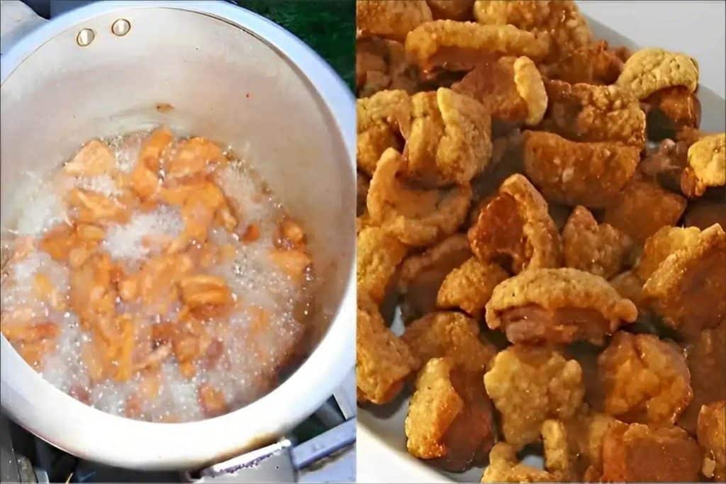 - No dia seguinte, disponha a gordura numa panela, leve em fogo médio, adicione o torresmo e deixe fritar bem até fique dourado e bem crocante.
