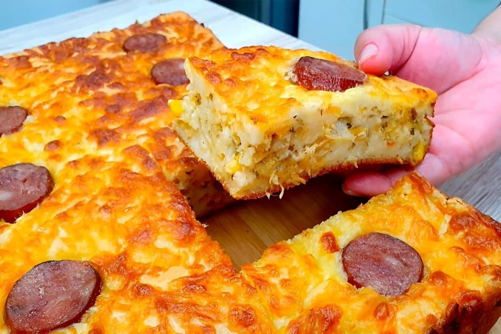 - Por cima da massa, distribuídas a muçarela ralada reservada e enfeite com algumas rodelas de linguiça calabresa.