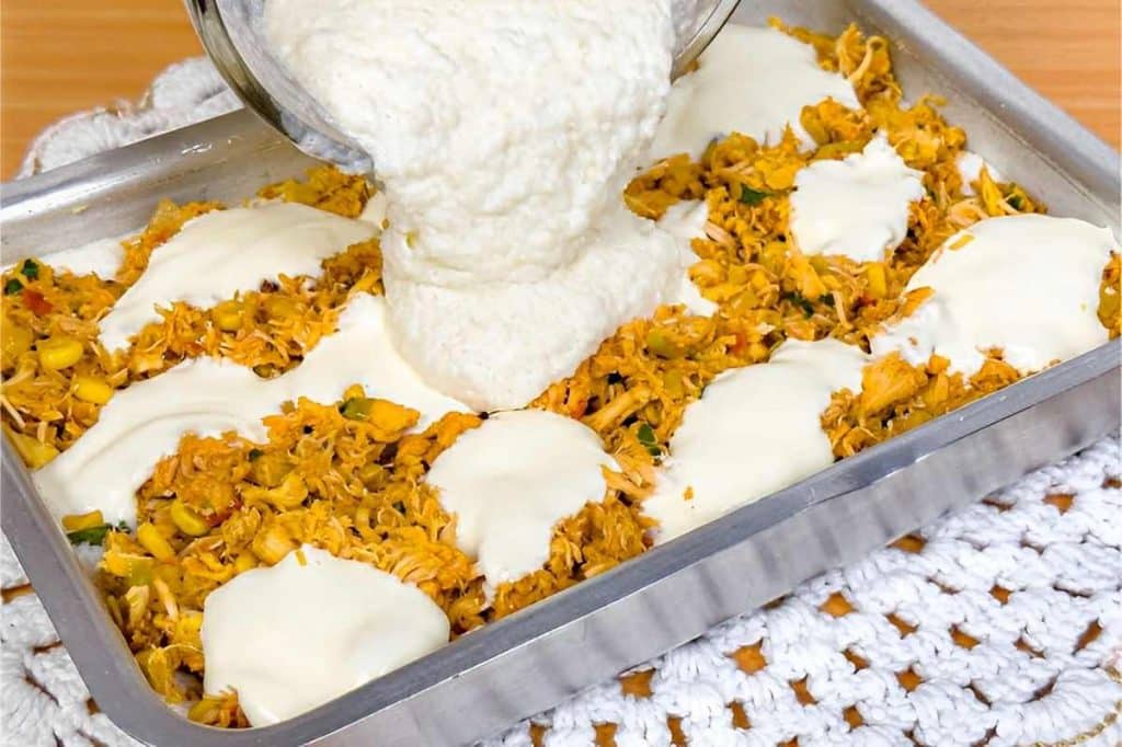 - Cubra com o recheio de frango e espalhe colheradas do requeijão cremoso.