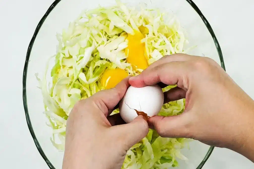 - Em uma tigela misture o repolho com sal, ovos, alho, tomate, cebola, azeitona, cheiro verde e açafrão.
