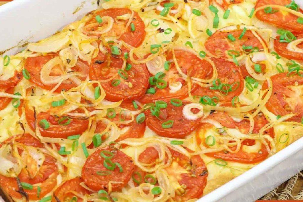 - Espalhe a massa em um refratário retangular (30 cm x 20 cm) previamente untado e enfarinhado. Cubra com as rodelas de cebola e tomate, distribuindo de forma uniforme.