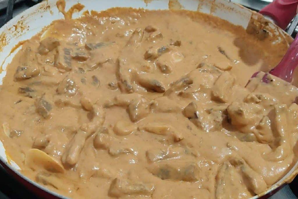 - Adicione o conhaque, flambe a carne e depois acrescente o creme de leite, a mostarda e o ketchup.